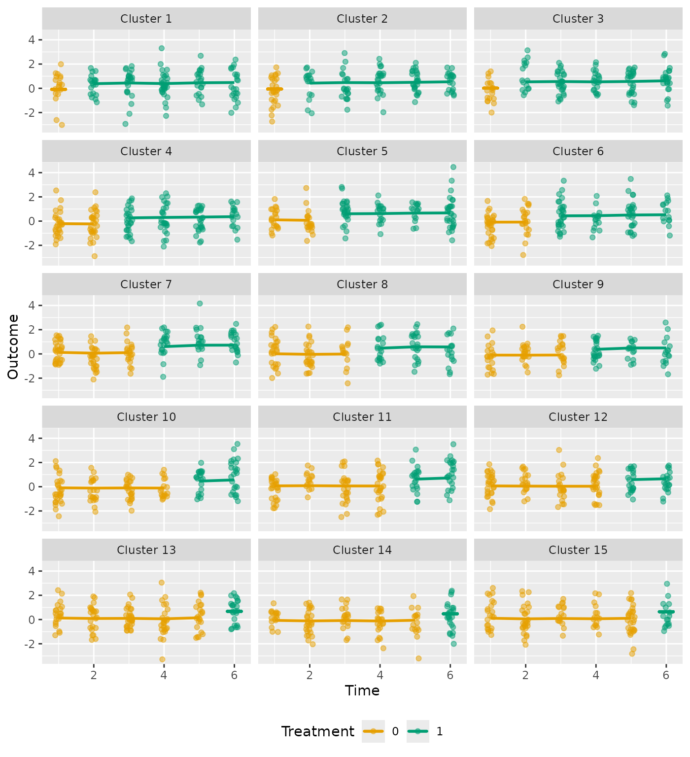 #> Stepped wedge dataset loaded. Discrete time design with 15 clusters, 5 sequences, and 6 time points.
