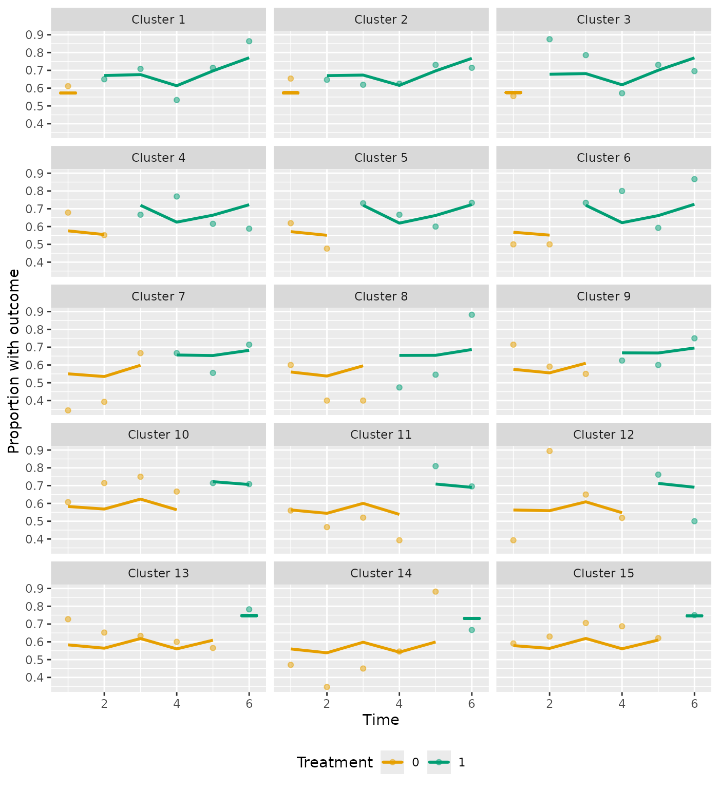 For binary outcomes, the observed probability for each cluster period is plotted as a point, with the predicted probabilities represented by the plotted line: